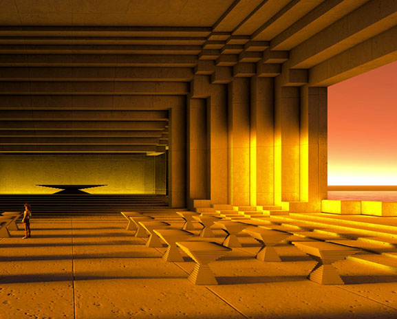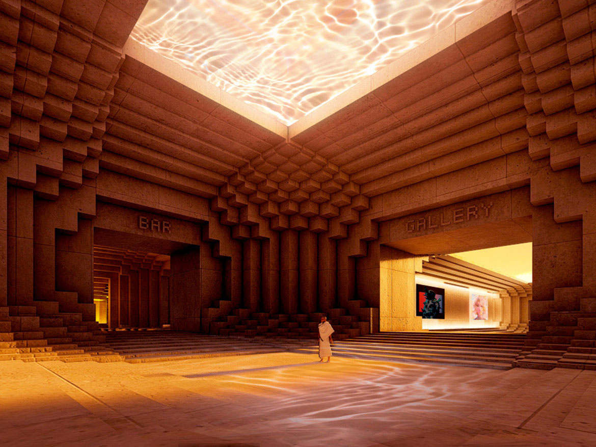 Agora is an interconnected series of open halls. The nexus is the main arrival hall, connecting long galleries, auditorium, and lounge. A key aspect of the design is achieving an environment and mood reflective of the source material.