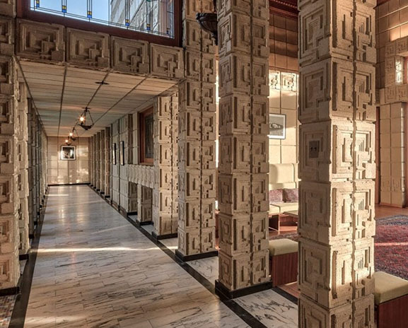 Vertical ribs have varying depths, creating relief patterns evoking the brutalist architectural sensibility in a softer expression. Right: Ennis House by Frank Lloyd Wright.