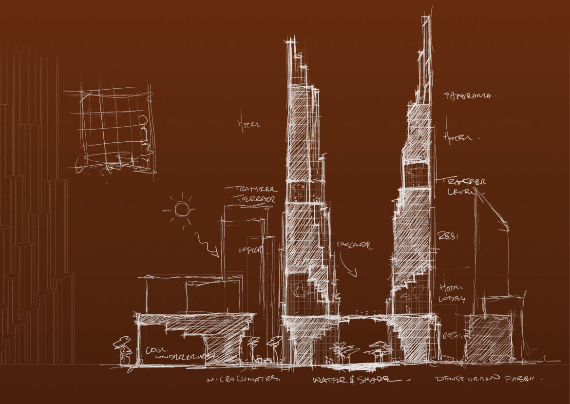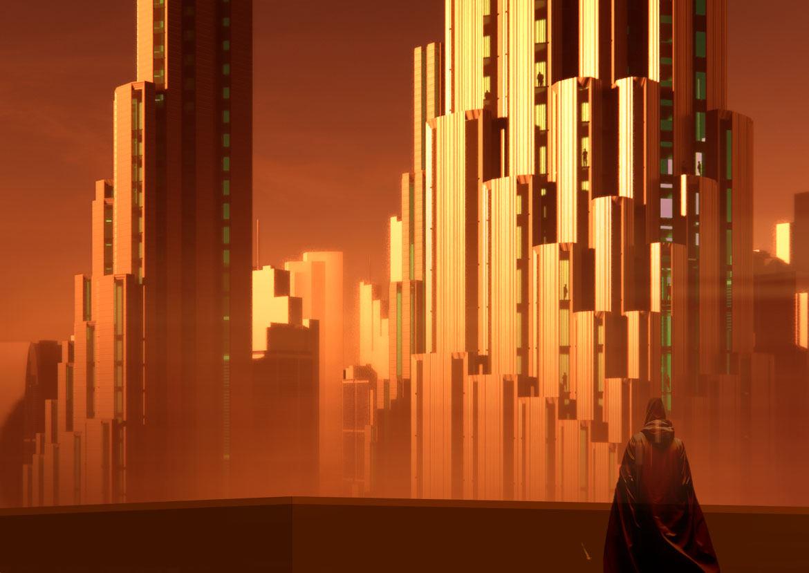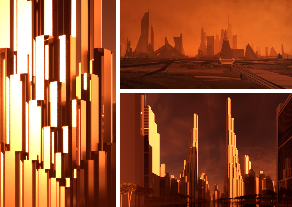 Architectural massing and design language also take cues from the source material. Tall building typologies echo the cubic, modularised style of the interior designs.